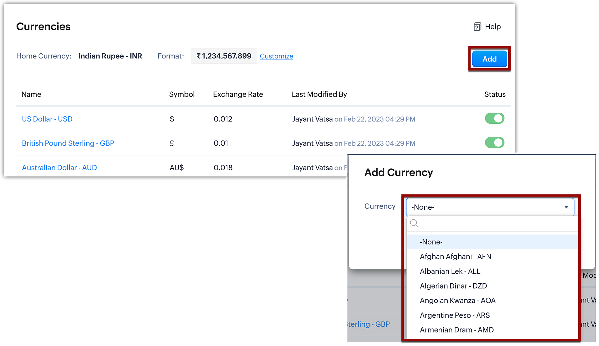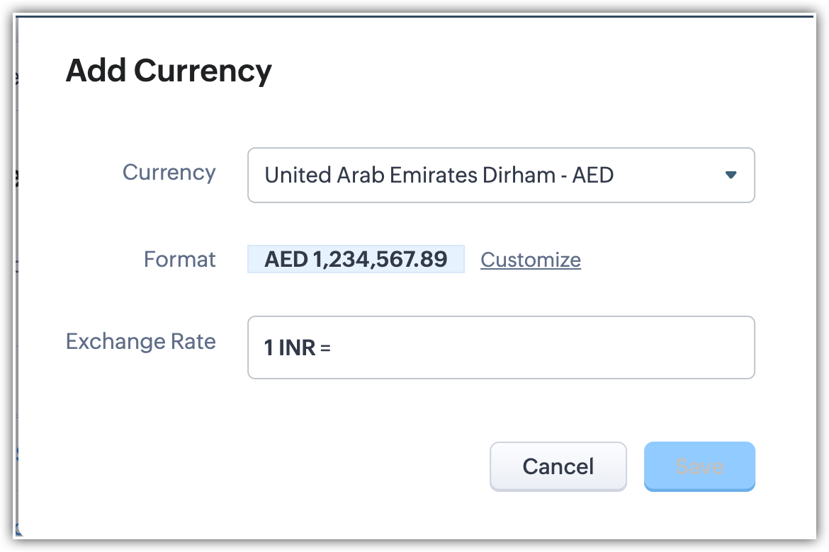 Gli Amministratori possono aggiungere quante valute desiderano all'account CRM dell'organizzazione. Tuttavia, solo 50 valute possono essere attive contemporaneamente nell'edizione Ultimate di Zoho CRM. Il numero di valute attive nel Suo account CRM varia a seconda delle edizioni a pagamento di Zoho CRM.