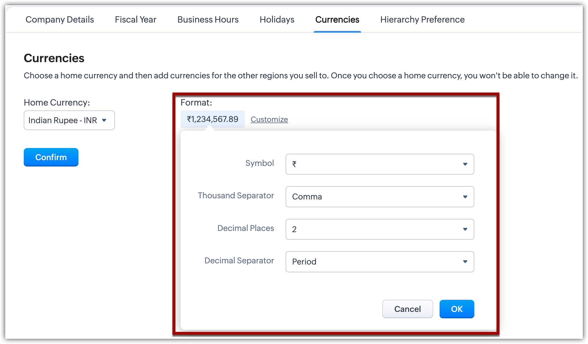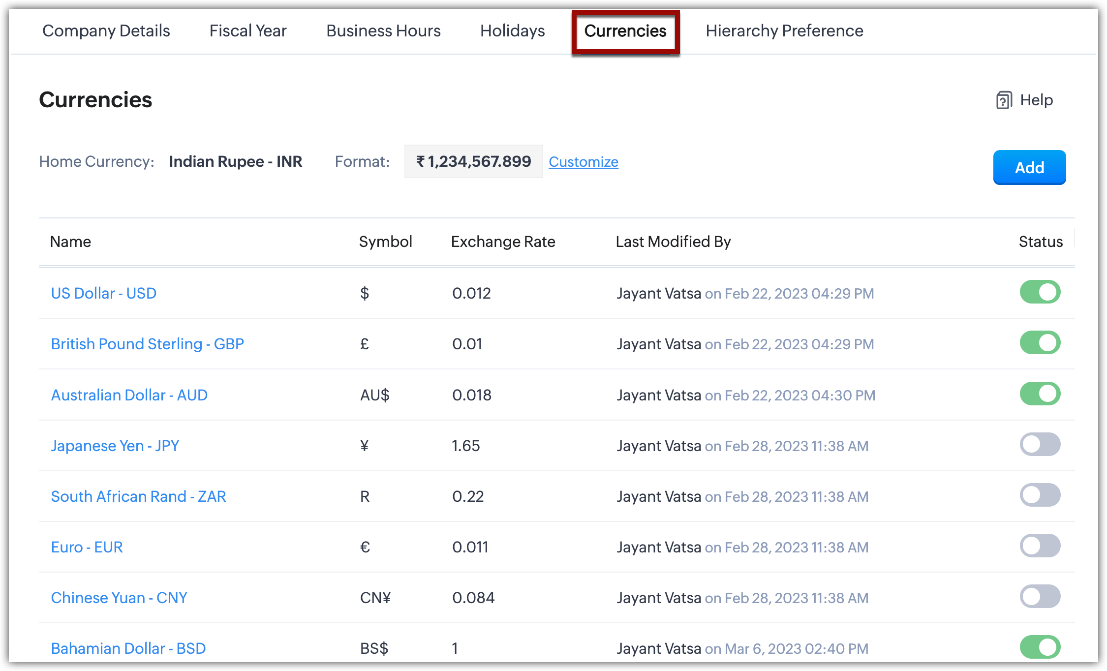 > General > Company Settings.Nella pagina Company Settings , vada a Currencies.