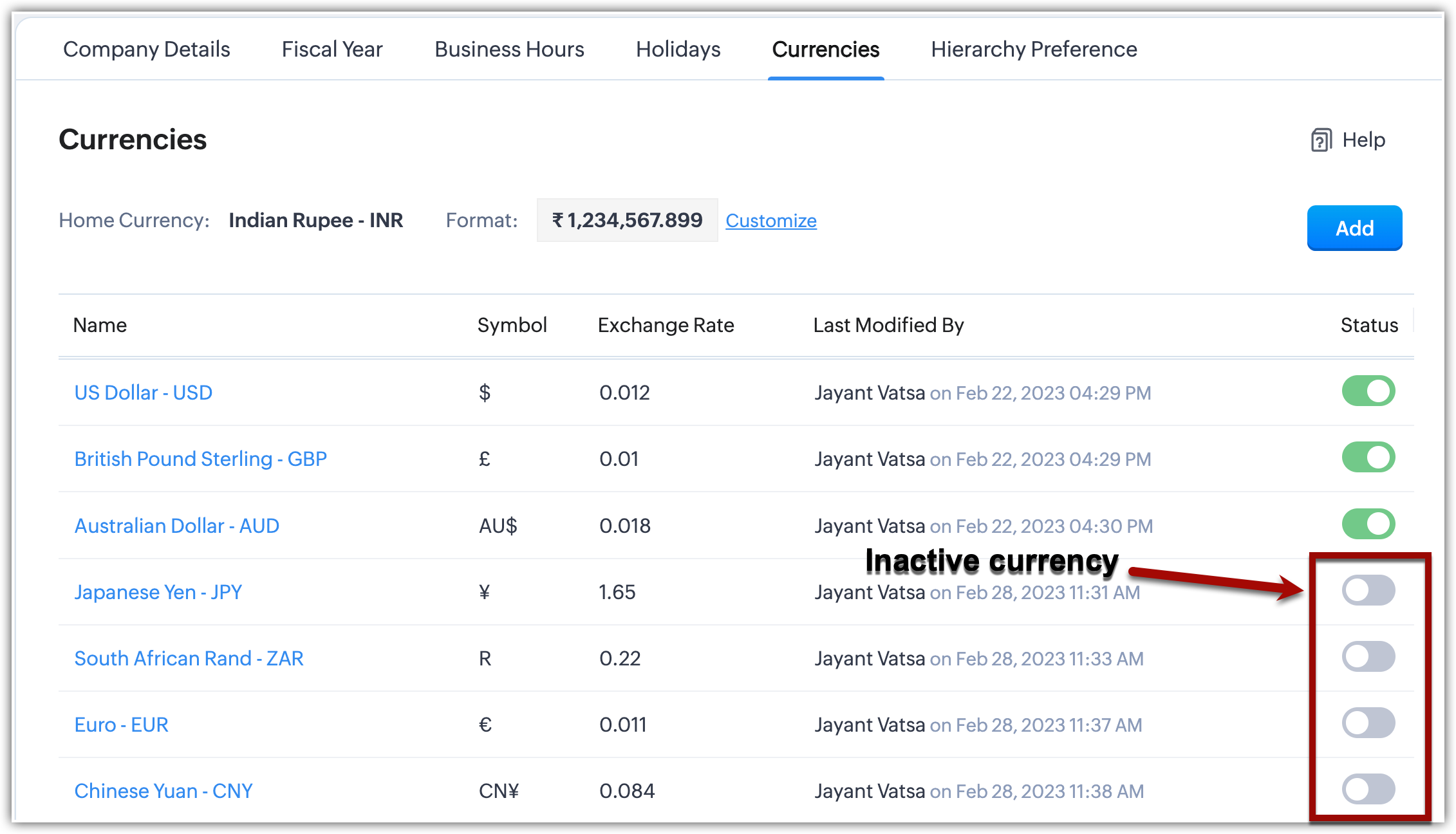 Se smette di operare in una determinata valuta, può disattivare la valuta specificata nel Suo account CRM cambiando il loro stato all'interno della piattaforma. Le valute specificate saranno ora inattive.