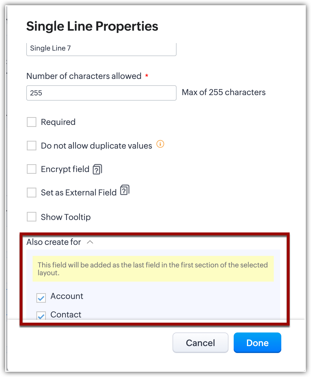 Sì, può creare simultaneamente campi in account, contatti e trattative durante la creazione di un campo personalizzato nel modulo leads. Questo è importante perché quando converte i lead in contatti è laborioso creare gli stessi campi nuovamente nel modulo contatti e poi anche nel modulo account e trattative.