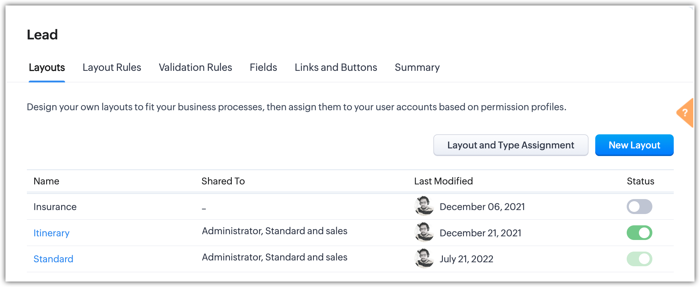 Clicchi sul modulo Leads e selezioni Layouts.