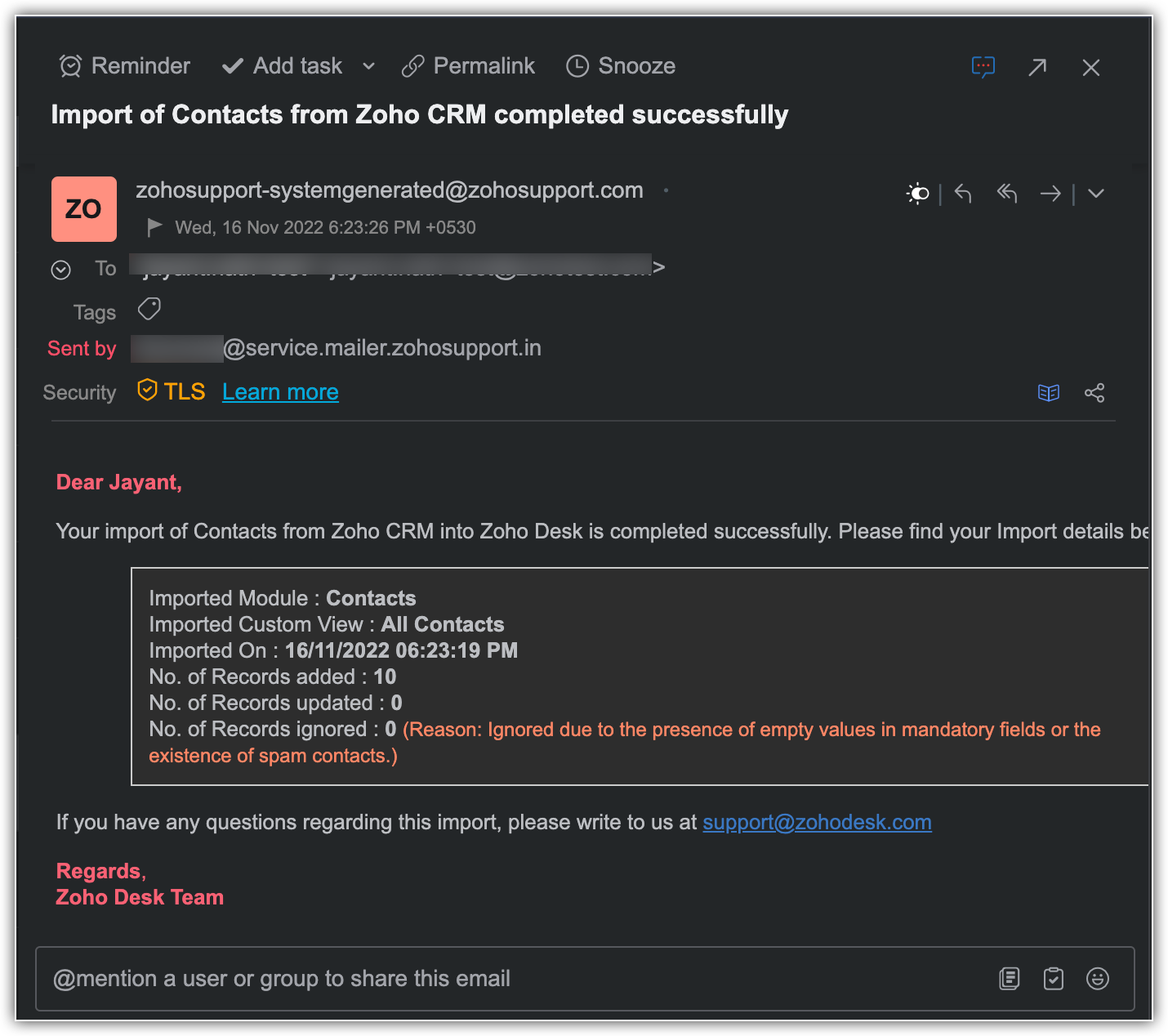 Sì, una volta completata l'integrazione Zoho CRM/Desk, riceverà una notifica email con le statistiche dei record aggiunti, aggiornati e ignorati e il motivo dei record saltati, se presenti.