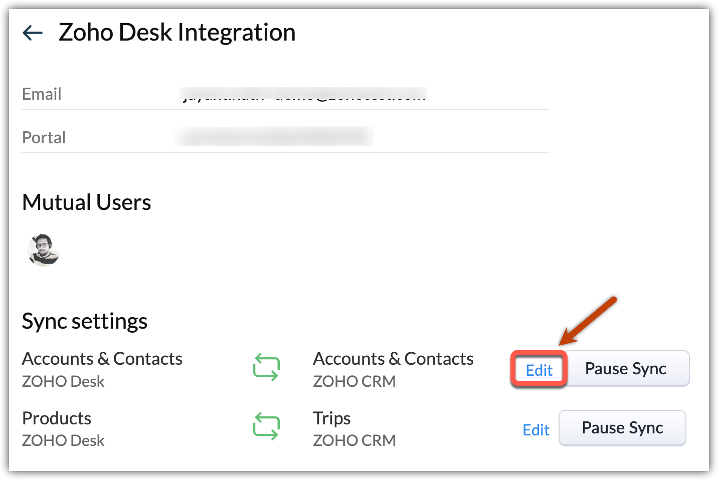 - Nella pagina Integrazione Zoho Desk, fare clic su Edit accanto al modulo corrispondente da Sync Settings.