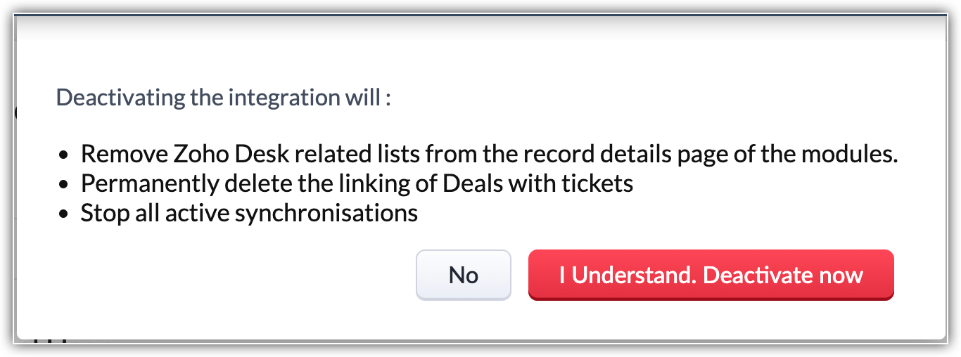 - Non avverrà più alcuna sincronizzazione dei dati tra Zoho CRM e Zoho Desk.