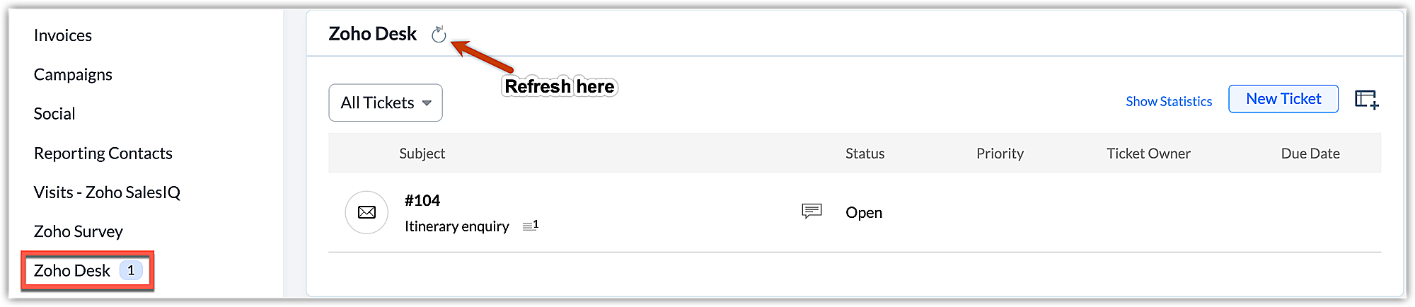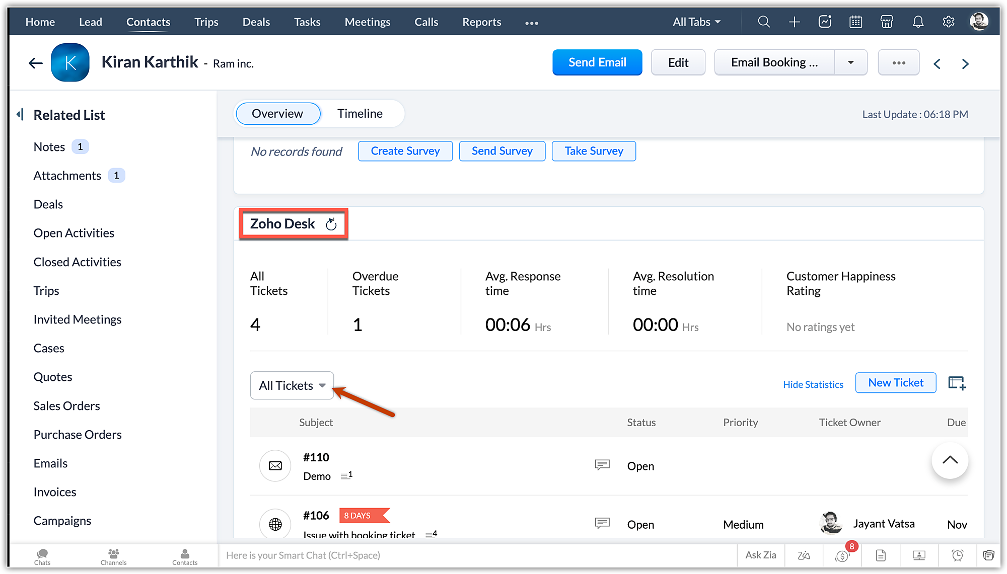 Se l'email esiste e i dati non vengono comunque recuperati, andare a quel record nel proprio account CRM e fare clic sul pulsante Refresh accanto a Zoho Desk, nell'elenco correlato Zoho Desk.