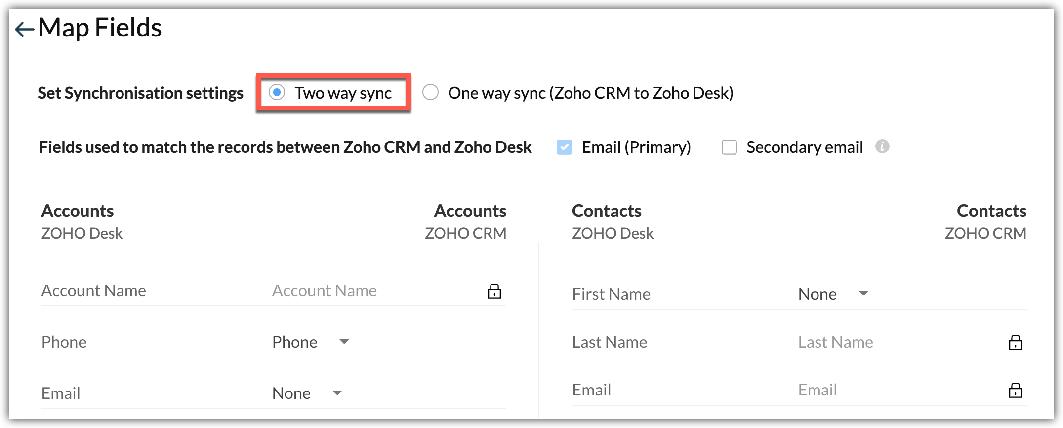 I record vengono sincronizzati da CRM a Desk e viceversa. La direzione di sincronizzazione significa che durante l'integrazione del CRM con Desk, è possibile configurarla in modo che i dati del CRM vengano sincronizzati con Desk oppure che i dati di CRM e Desk vengano sincronizzati in entrambe le direzioni, definite rispettivamente sincronizzazione unidirezionale e bidirezionale.