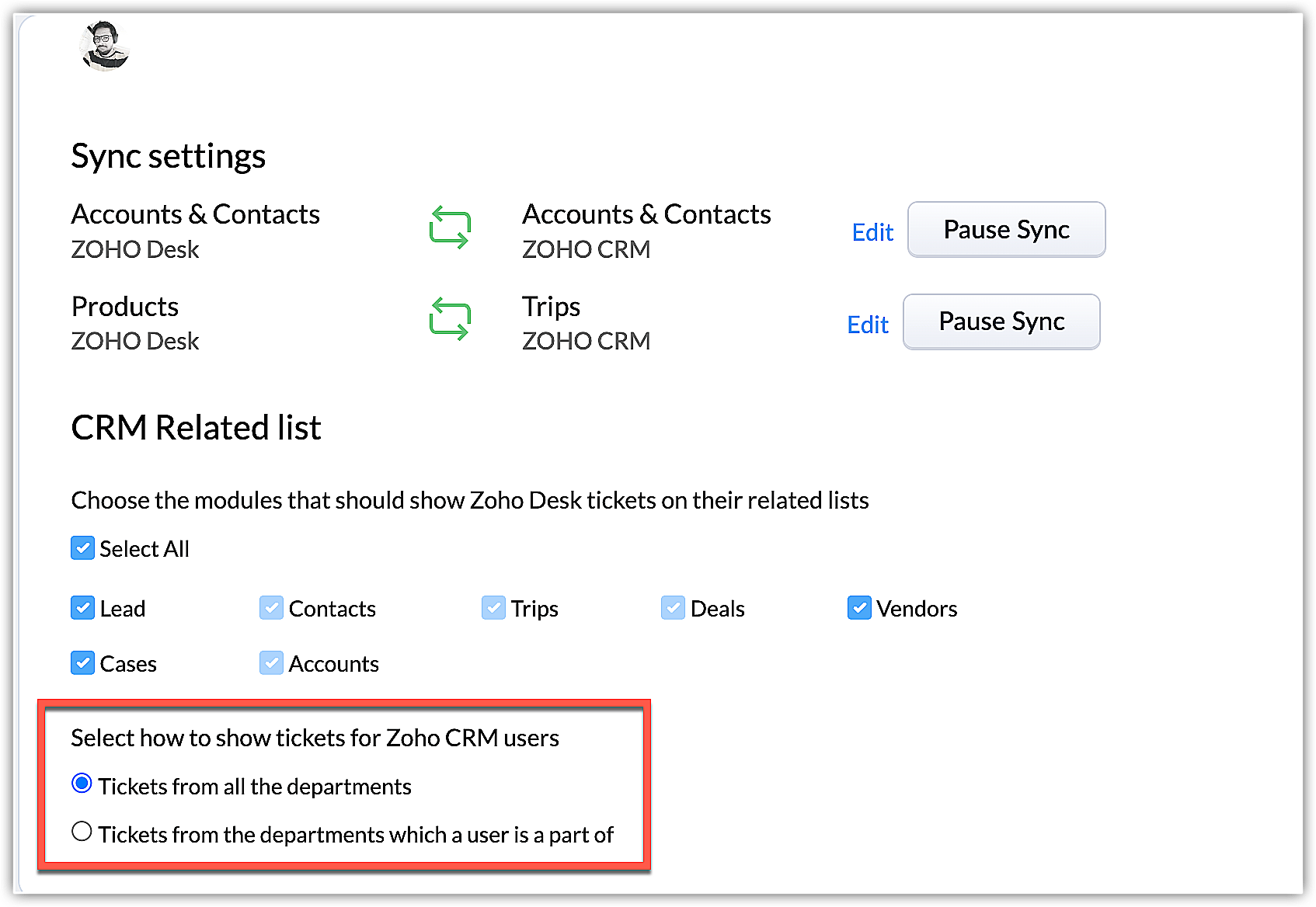 Questo accade perché durante la configurazione dell'integrazione, l'amministratore ha modificato il modo in cui un utente CRM può visualizzare i ticket nei moduli Contatti e Account. Sono disponibili due opzioni per la selezione nella pagina di integrazione Desk.
