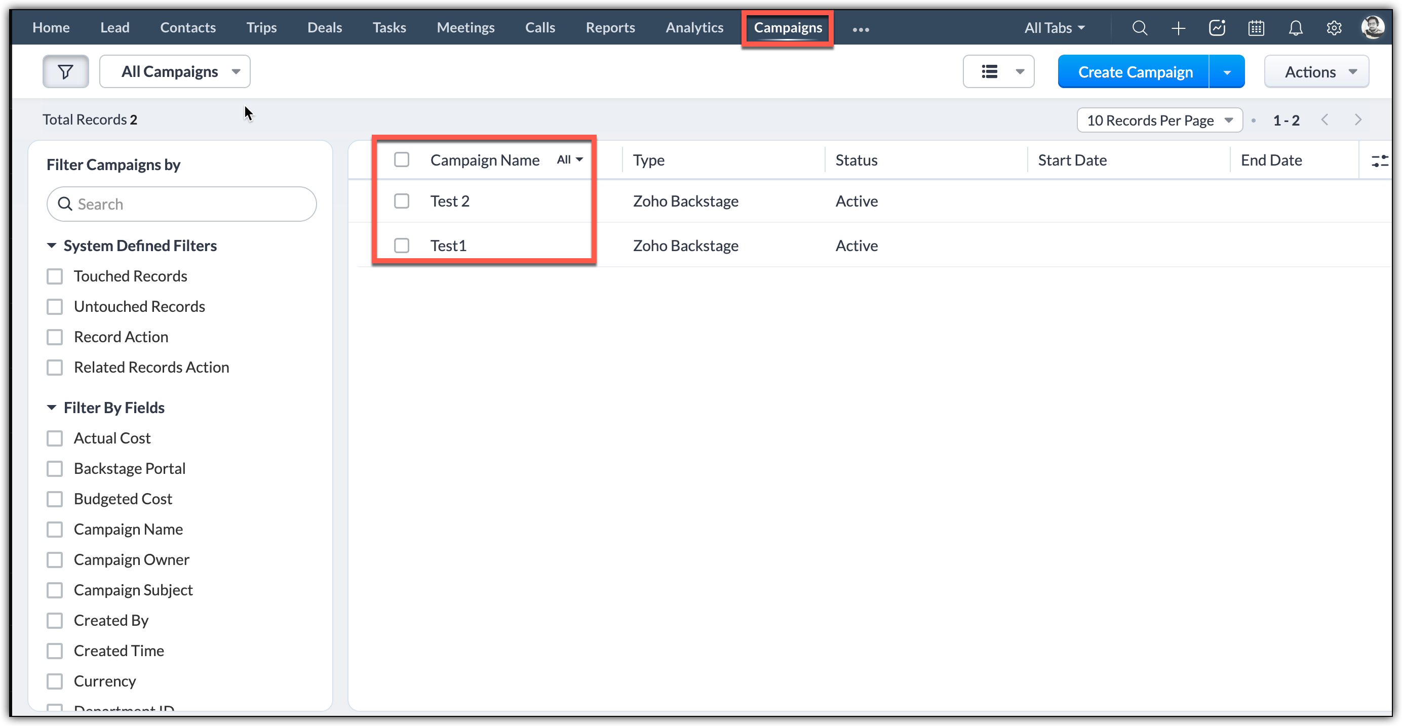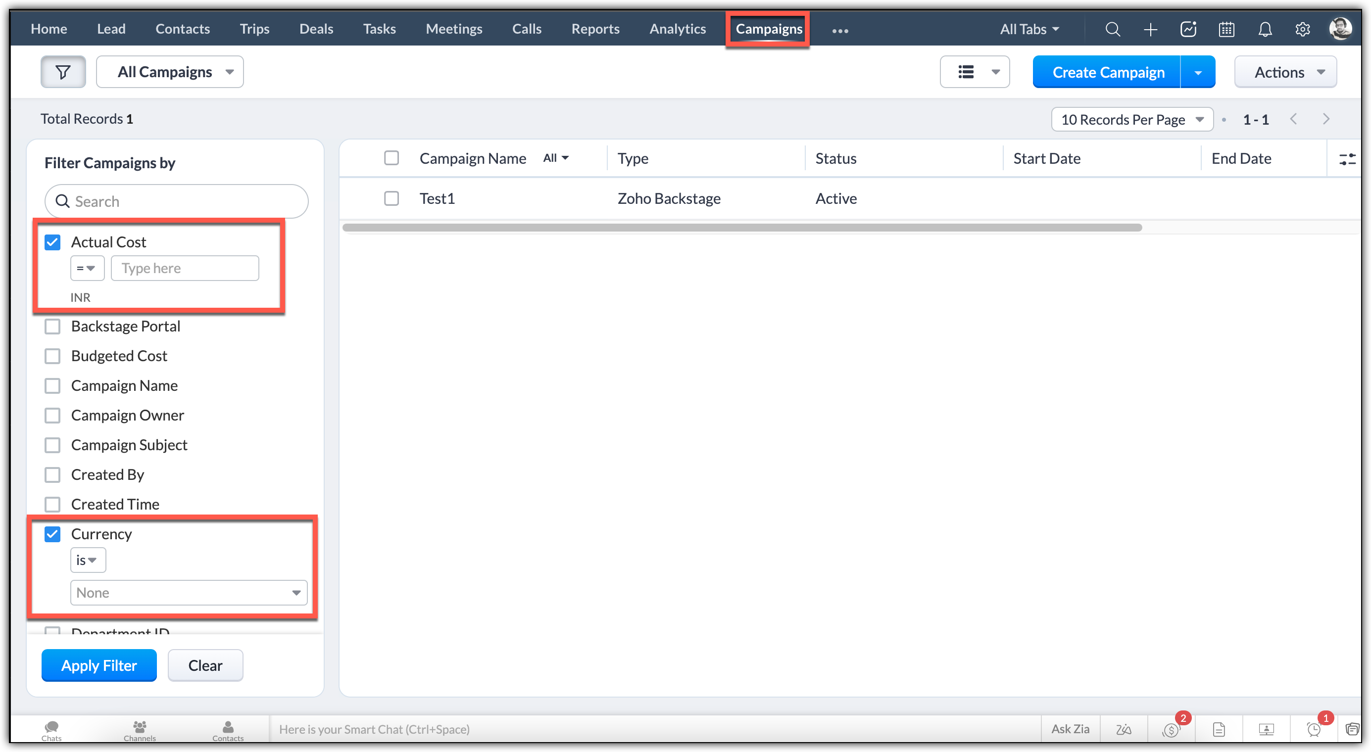 I costi, le spese, e la valuta saranno riflessi nella scheda Filter Campaigns by nel modulo campagne del Suo CRM.