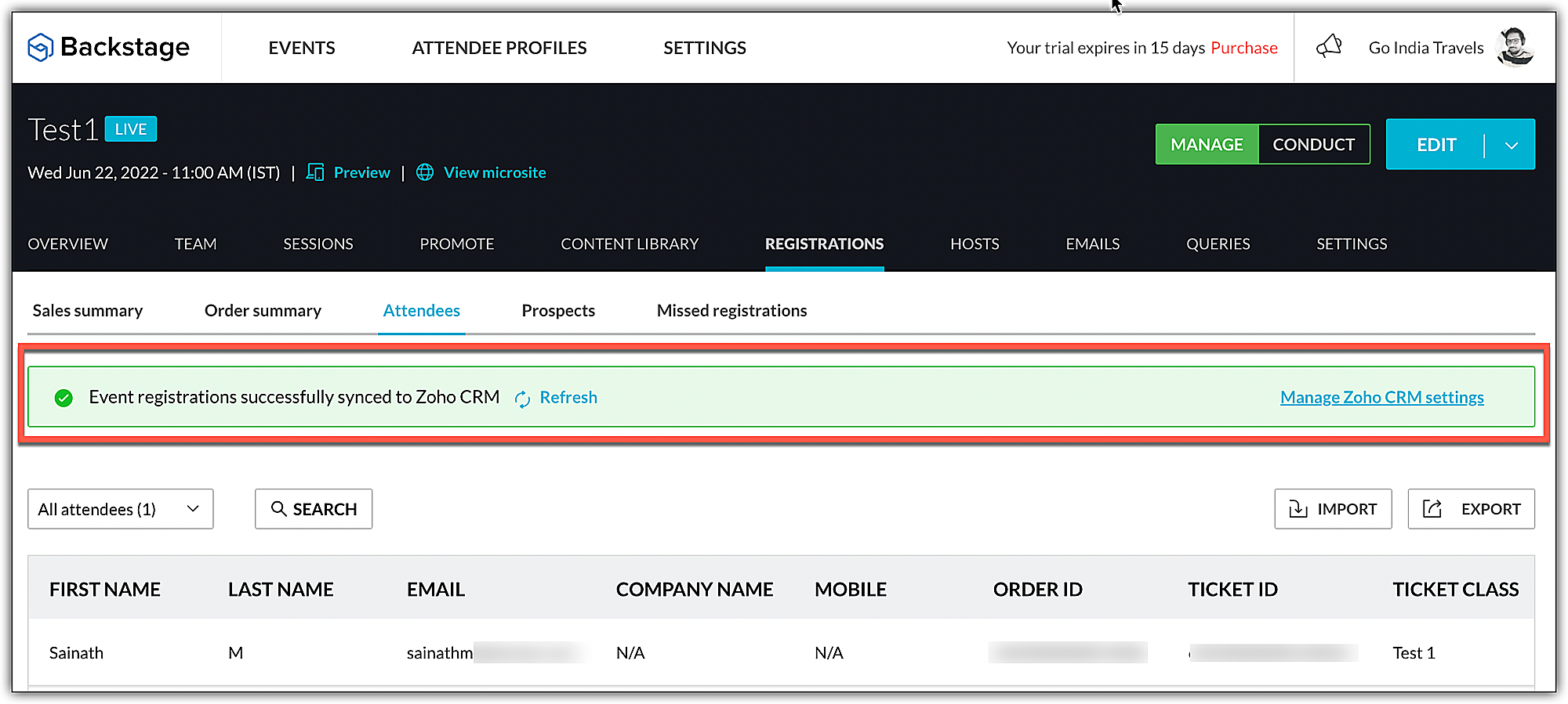 Dopo aver integrato con successo Zoho Backstage con Zoho CRM, è necessario configurarlo nella sezione Integration del menu Settings di Zoho Backstage. È possibile che durante la configurazione, i partecipanti non siano stati sincronizzati con i moduli Lead o Contacts. È necessario configurarlo in modo che i partecipanti vengano riflessi nei moduli Contacts o Lead.