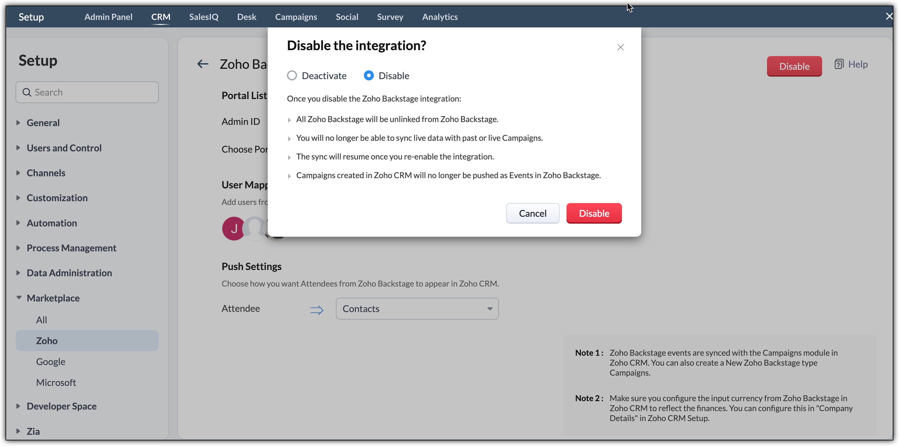 Per copiare il campo di personalizzazione dal Suo account CRM, è necessario disabilitare l'integrazione tra il Suo account CRM e Zoho Backstage. L'eliminazione dell'integrazione scollegherà tutti i dati tra Backstage e il Suo account CRM. La sincronizzazione verrà disabilita e non sarà più possibile sincronizzare dati in tempo reale. Non elimini l'integrazione né la disattivi. Invece, si limiti a disabilitare temporaneamente l'integrazione.