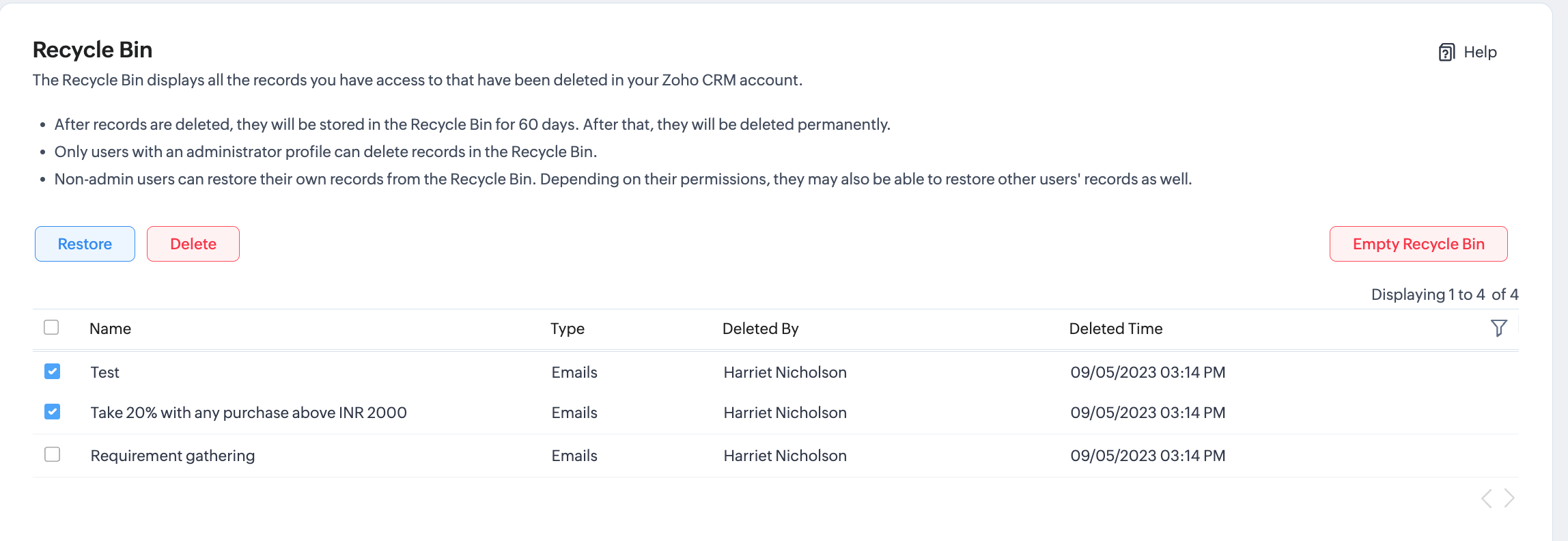 Tutti i record e i file eliminati dall'account Zoho CRM vengono archiviati nel cestino. È possibile ripristinare i record dal cestino entro 60 giorni, dopo i quali verranno eliminati definitivamente dal Suo account CRM. È inoltre possibile eliminare manualmente i record dal cestino prima del periodo di eliminazione predefinito.