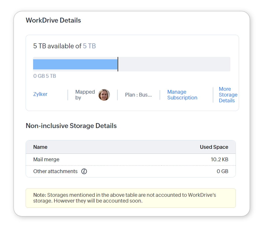 NotaSe ha integrato altre app Zoho con WorkDrive, il loro spazio di archiviazione verrà combinato e visualizzato come spazio di archiviazione totale in WorkDrive. Non si applicano restrizioni specifiche per app a questo spazio, poiché è condiviso tra tutte le app.