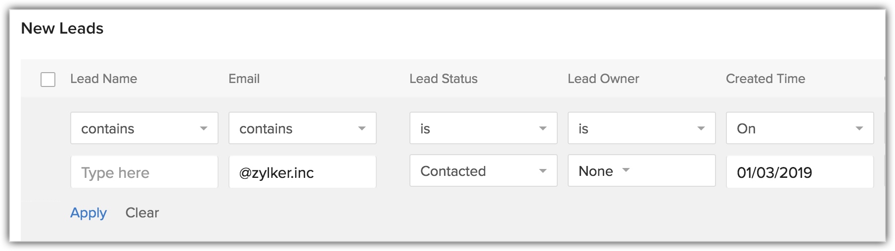 Supponiamo che Zylker abbia recentemente condotto un webinar a cui hanno partecipato 200 persone. Come azione di follow-up, desiderano inviare la brochure del prodotto solo ai partecipanti che appartengono al settore immobiliare. Per scoprire quale partecipante appartiene al settore immobiliare, dovrebbero scorrere i singoli record, operazione che può essere noiosa e dispendiosa in termini di tempo. Per affrontare queste situazioni, è possibile filtrare i record in base a criteri specifici. È possibile utilizzare qualsiasi campo per impostare questi criteri, a condizione che tali campi siano già stati aggiunti nell'elenco correlato.