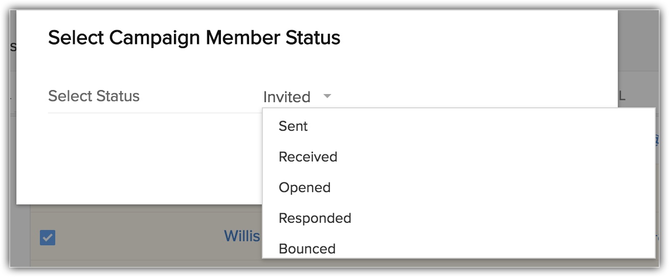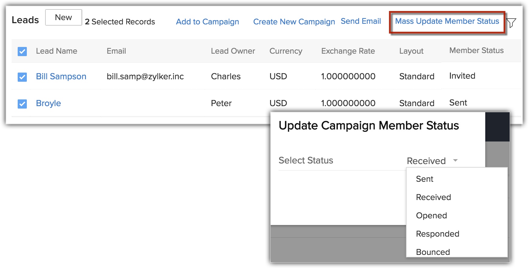 Lo stato membro campagna mostra lo stato dei lead o contatti in una campagna specifica come invitato, ricevuto, inviato ecc. È possibile aggiornare massivamente lo stato membro dei lead o contatti dalla pagina dettagli Campaigns.