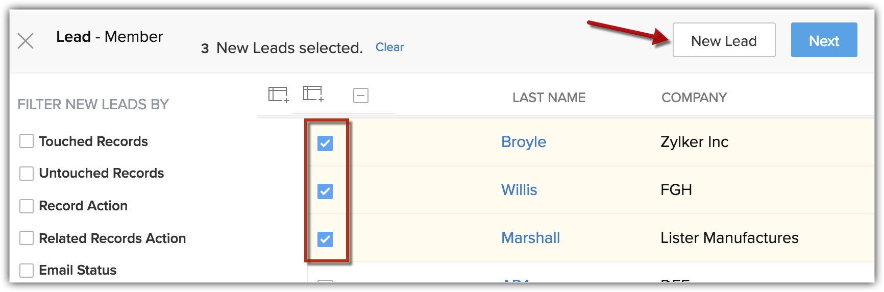 - Selezionare il Lead/Contatto dall'elenco e fare clic su Avanti.