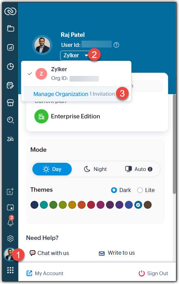 I super amministratori e gli amministratori CRM hanno entrambi il privilegio di creare più account organizzativi. Questo consentirà loro di accedere a più account utilizzando credenziali di accesso comuni. Gli utenti non amministratori possono essere invitati a unirsi a questi account organizzativi. Possono accettare l'invito e far parte di più account organizzativi.