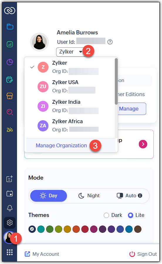 - Elenco organizzazioni: L'utente può andare sull'icona del profilo, cliccare sulla freccia verso il basso accanto al nome dell'organizzazione e cliccare su Manage Organization.