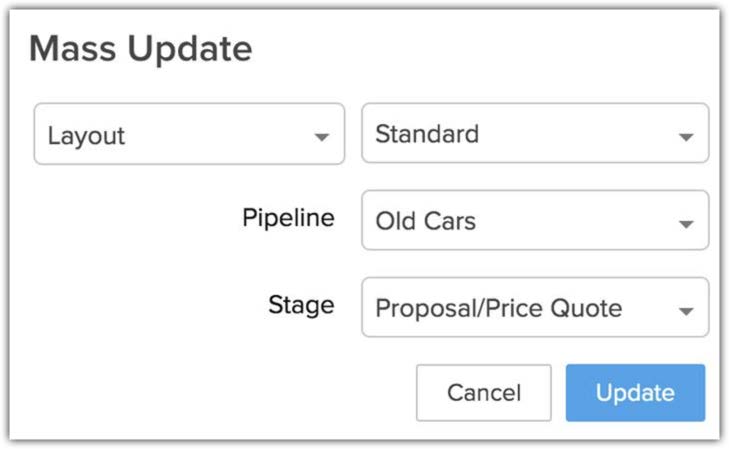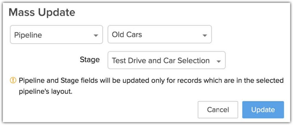 Poiché una pipeline è strettamente collegata a un layout, quando si aggiorna in massa la pipeline dei record, il CRM verificherà se i record appartengono al layout in cui si desidera spostarli. Ad esempio, si immagini di avere due layout: Vendite e Servizi, ciascuno con due pipeline. Se si selezionano alcune trattative dalla vista elenco e le si spostano in una pipeline che appartiene al layout Vendite, solo le trattative che già appartengono al layout Vendite verranno spostate. Le trattative rimanenti verranno ignorate perché appartengono a un layout diverso.