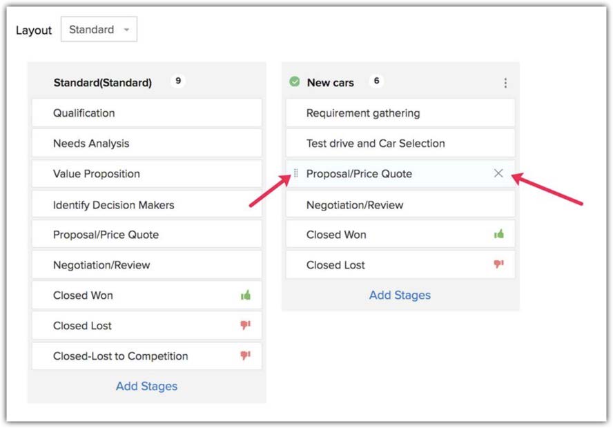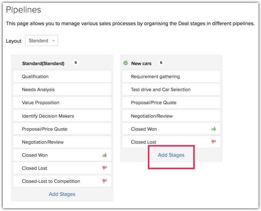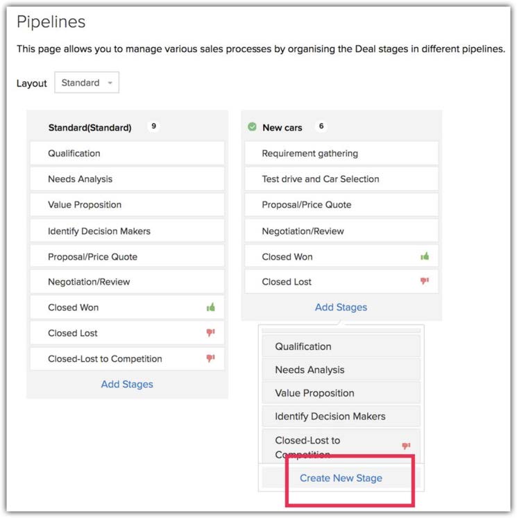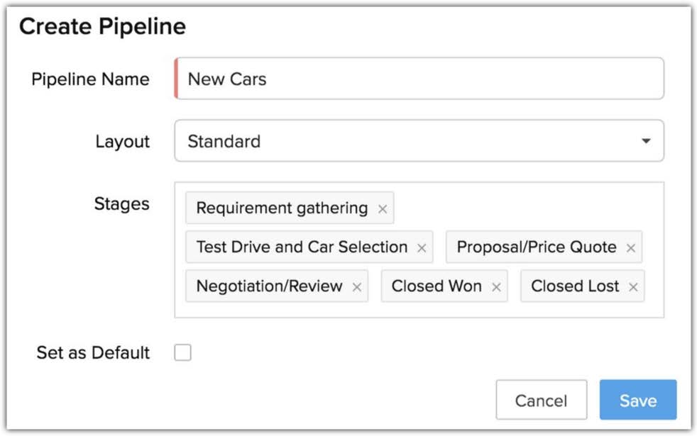 Poiché ogni processo è diverso, far passare tutte le trattative attraverso un'unica pipeline non darà una chiara comprensione del loro progresso. Pertanto, Zylker Cars deve creare pipeline di vendita multiple per mostrare più accuratamente come una trattativa sta progredendo.