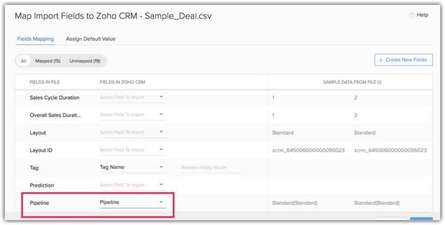 Importazione di trattative per una pipeline diversa: Se si desidera importare record che appartengono a pipeline diverse, è necessario aggiungere una colonna al file di importazione con i dettagli della pipeline a cui appartiene il record. Mappare questo campo con il campo Pipeline del CRM durante l'importazione.