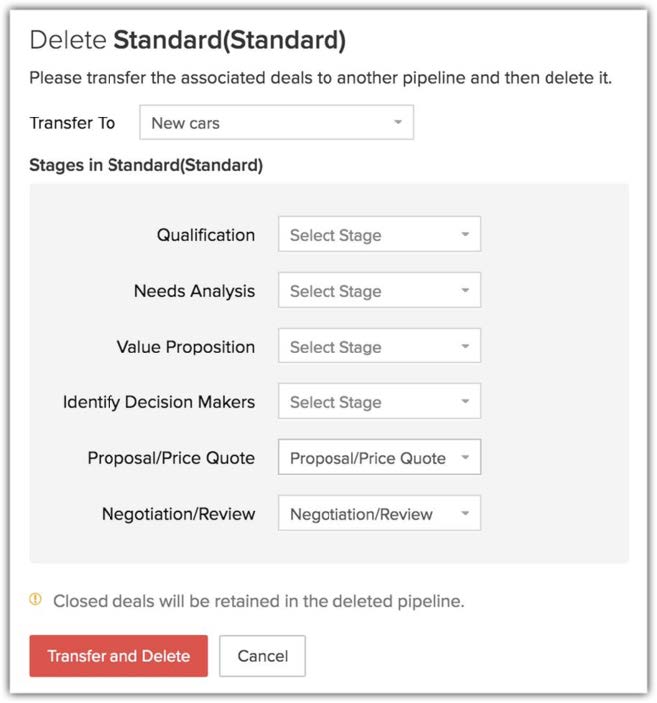 - Le trattative già chiuse rimarranno nella pipeline eliminata e non verranno trasferite a un'altra.
