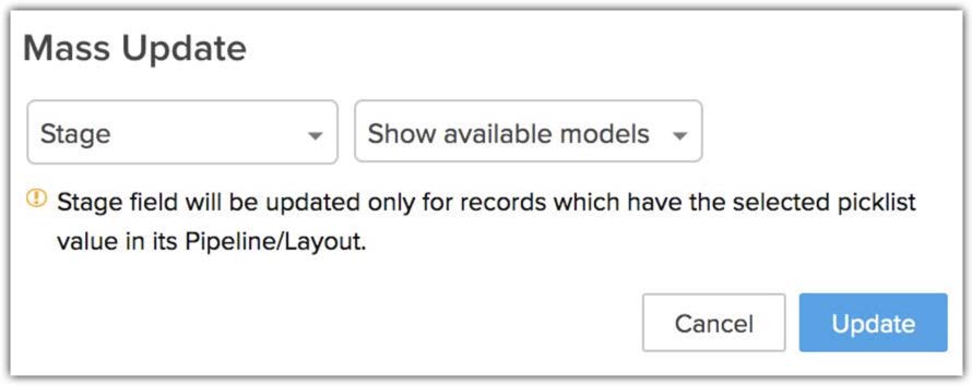 Quando si effettua un aggiornamento di massa dei record, è importante tenere presente che una pipeline è specifica per layout e le fasi al suo interno sono specifiche per una particolare pipeline. Durante l'aggiornamento di massa, i record verranno sempre verificati per una corrispondenza nel seguente ordine: Layout > Pipeline > Fase. (È possibile aggiornare in massa il layout, il campo pipeline e il campo fase dei record).