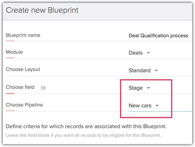 Il campo Fase è spesso utilizzato nei Blueprint. Generalmente, i Blueprint sono specifici per layout, ma se sono state create pipeline nel layout, sono specifici per pipeline. Se si crea un Blueprint basato sul campo Fase, sarà necessario selezionare la pipeline a cui è associato. Tutti i valori nel campo Fase verranno utilizzati nella progettazione del Blueprint.