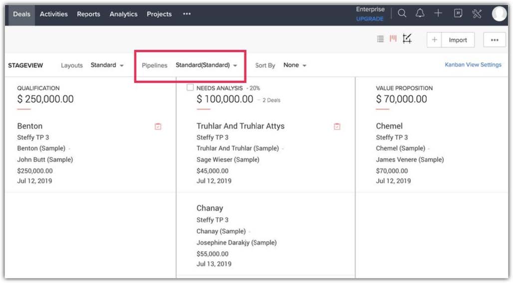 c) Con molteplici trattative nel software, cercare di visualizzare ciascuna di esse per determinarne lo stato potrebbe risultare piuttosto gravoso. Tuttavia, all'interno di Zoho CRM, è possibile visualizzare le trattative in un'unica vista con l'aiuto della vista kanban . Visualizzerà i dati in modo organizzato.